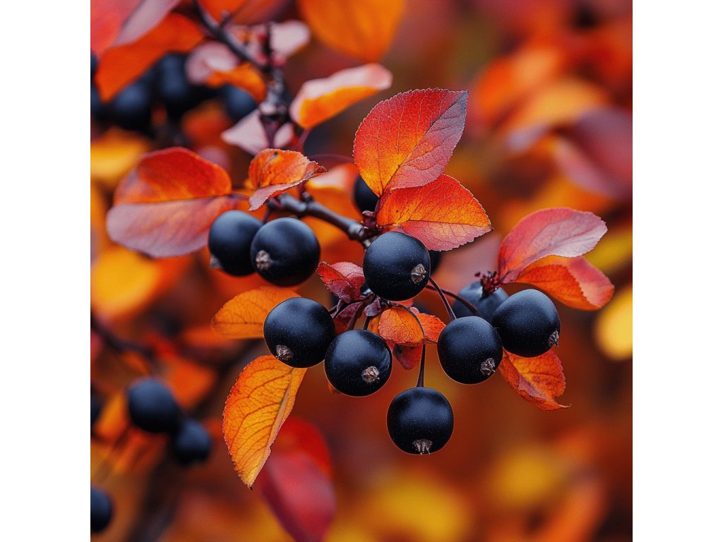 - Plody 🍇: Černé, lesklé bobule bohaté na vitaminy C, K a antioxidanty, vhodné pro přímý konzum, zavařování či sušení