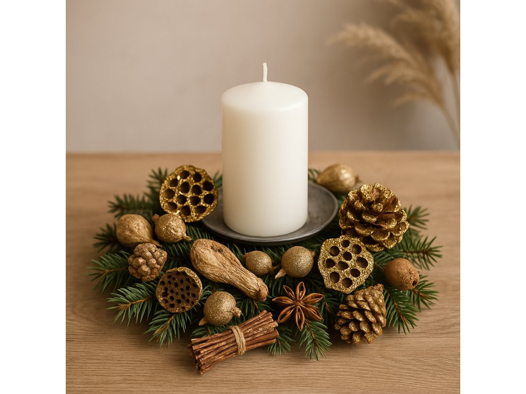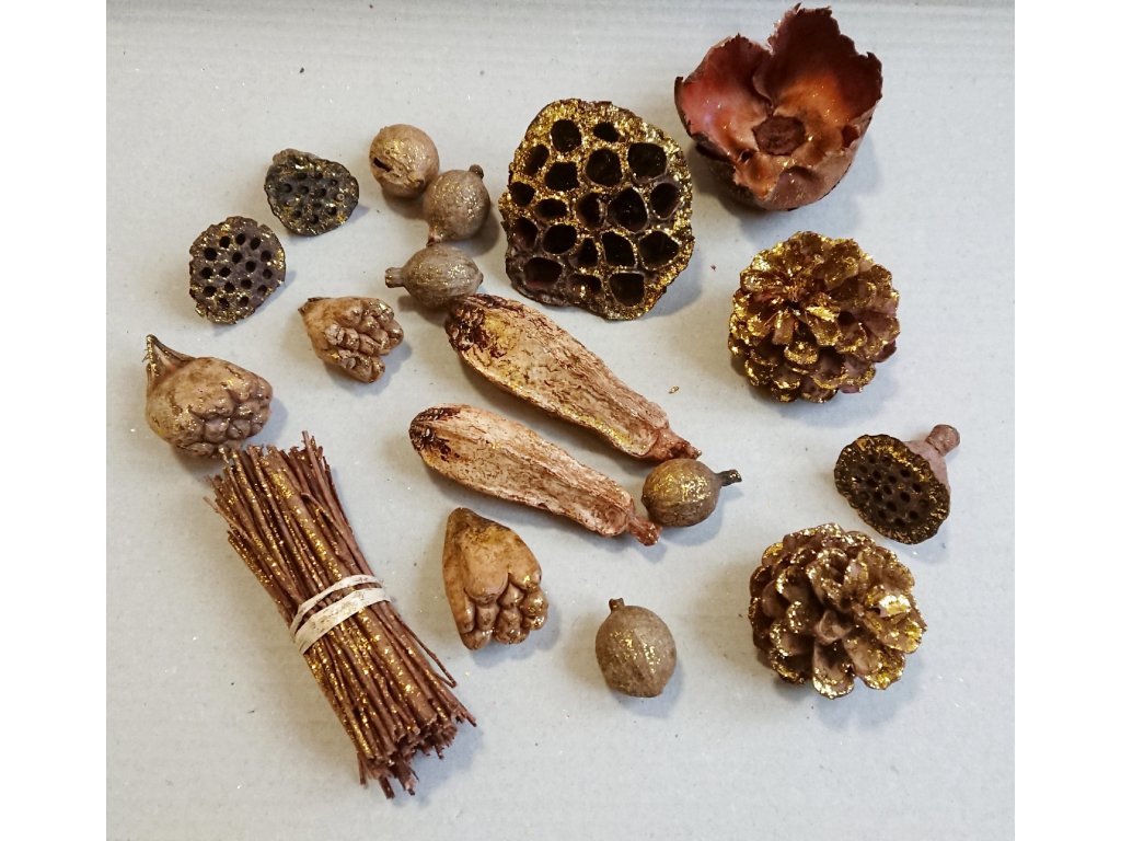 Tato vánoční dekorační sada obsahuje směs přírodních prvků, které jsou upraveny do sváteční zlaté barvy. Najdete v ní šišky, semeníky, sušené květy, plody i svazek proutí. Vše je připraveno k okamžitému použití pro výrobu věnců, svícnů, ozdobných aranžmá či jako doplněk do misek a dekorativních nádob. Každý kousek působí autenticky a díky zlatému nádechu přináší do interiéru slavnostní atmosféru.