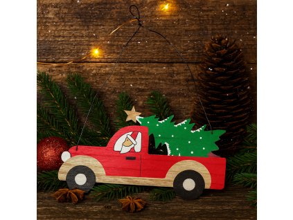 Veselá závěsná dekorace v podobě červeného dřevěného auta se Santou a vánočním stromkem přináší do interiéru hravý sváteční prvek. Kombinace přírodního dřeva a ručního malování působí útulně, zatímco kovový drátek umožňuje snadné zavěšení. Ideální k ozdobení dveří, stěny nebo většího věnce. Díky detailnímu zpracování se stane oblíbenou součástí každoroční výzdoby.