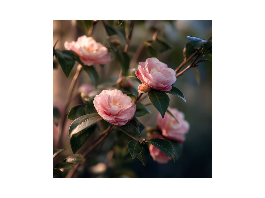 Květy jsou plné, jemně růžové s bílými tóny a objevují se od února do dubna. Díky časnému kvetení patří kamélie mezi výjimečné keře, které přinášejí barvu do zahrady v období, kdy většina rostlin ještě nekvete.