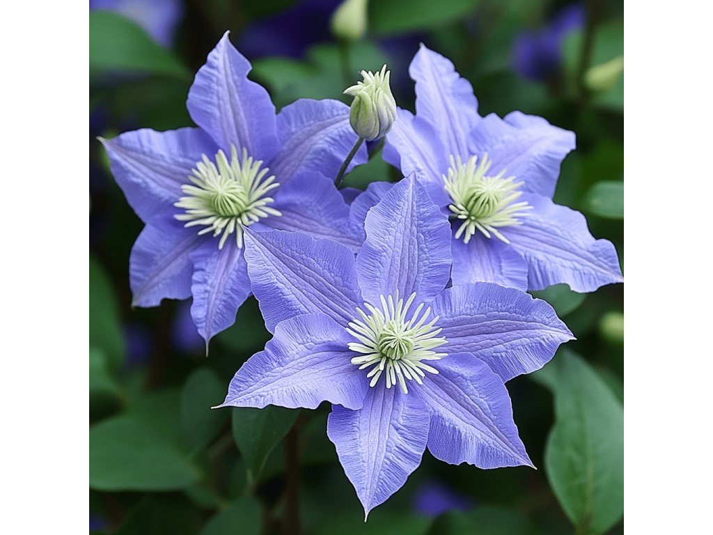 - Květy 🌸: Středně velké (cca 5–8 cm), modrofialové, v dlouhém období od června do září