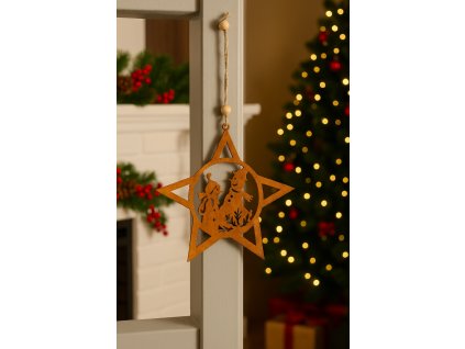 Plechová vánoční hvězda se zimním motivem v rezavém provedení – originální vánoční dekorace na zavěšení. ⭐ Díky jutovému provázku ji snadno umístíte na stromek, věnec, dveře či do okna.