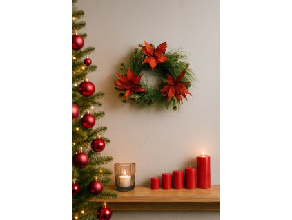 Nádherně zdobený vánoční věnec na proutěném základu, kombinující borové a modřínové větvičky s přírodními šiškami a výraznými květy červené vánoční hvězdy. Kompozice je doplněna o dekorativní plody brusinek a jemné zlaté akcenty, které věnci dodávají slavnostní lesk a teplo.