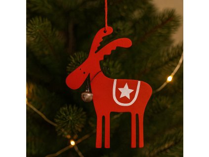 Vánoční závěsný sobík v červeném provedení s bílým sedlem a malou rolničkou vnese do interiéru veselou a přitom decentní atmosféru. Dřevěná silueta s bílým detailem hvězdy působí tradičně i moderně, podle stylu ostatních dekorací. Je lehký, snadno se zavěsí na stromek, větvičku nebo do okna a rozezní jemné cinknutí při každém pohybu. Působí útulně a doplňuje přírodní vánoční výzdobu.