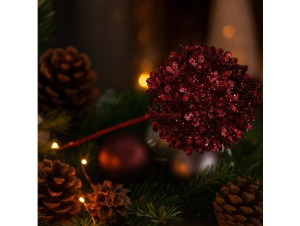 Dekorační květ okrasného česneku v tmavě červeném odstínu je bohatě posypán třpytkami, takže krásně chytá světlo svíček i řetězů. Díky dlouhému ohebnému stonku z drátu obaleného červenou páskou se snadno tvaruje do váz, věnců i svátečních aranžmá. Vynikne samostatně i v kombinaci s jehličnany, šiškami a kovovými doplňky. Vhodné pro opakované použití v interiéru.