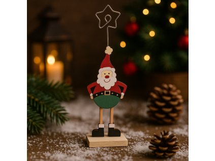 Dřevěný stojánek s motivem Santa Clause je veselým doplňkem vánoční výzdoby i praktickým držákem na fotografie nebo přání. Barevné zpracování v tradiční červené, bílé a zelené barvě vytváří hravý, ale vkusný dojem. Díky lehké konstrukci jej snadno umístíte na poličku, pracovní stůl nebo slavnostně prostřený stůl. Kovový drátek ve tvaru hvězdy slouží k uchycení fotografie, vizitky či vzkazu.