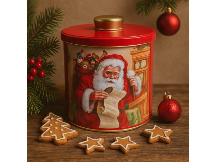 Kovová vánoční dóza s motivem Santy Clause přináší do interiéru kouzlo tradičních Vánoc. Kulatý tvar a syté červené víko ladí s retro ilustrací veselého Santy čtoucího seznam přání. Dóza je ideální na ukládání perníčků, cukroví, čajů nebo drobných dekorací. Kvalitní kov zaručuje dlouhou životnost a snadnou údržbu, zatímco ilustrace působí hřejivě a nostalgicky.