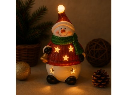 Keramická figurka sněhuláka s průlisy ve tvaru hvězdiček vytváří příjemné světelné efekty pro zimní výzdobu interiéru. Tělo jemně prosvítá díky LED diodám uvnitř, bambule na čepici samostatně barevně bliká. Součástí je zlatý zvoneček v ruce a zelená šála, které doplňují tradiční sváteční vzhled. Dekorace je napájena bateriemi typu LR44 (jsou součástí balení) a hodí se na komodu, parapet i sváteční stolek.