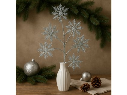 Stříbrná dekorační větvička s drobnými sněhovými vločkami působí elegantně a zimně. Jemné plastové vločky na ohebném kovovém stonku zachycují světlo a vytvářejí efekt jiskřivého mrazu. Díky délce 75 cm se hodí do váz, adventních aranžmá i svátečních dekorací. Je ideálním doplňkem pro kombinaci s přírodními větvemi, šiškami nebo vánočními ozdobami ve stříbrné a bílé barvě.