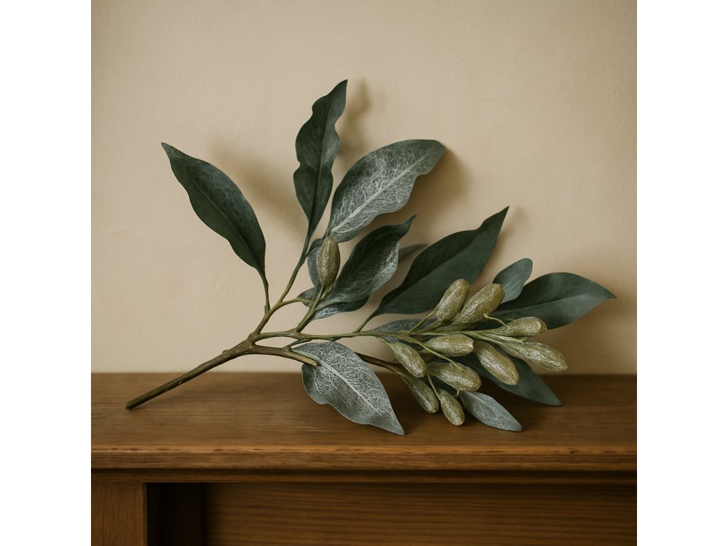 Dekorační větvička s šedozelenými listy a jemným posypem glitrů dodá každému aranžmá sváteční atmosféru. Díky realistickému provedení působí přirozeně a zároveň elegantně.