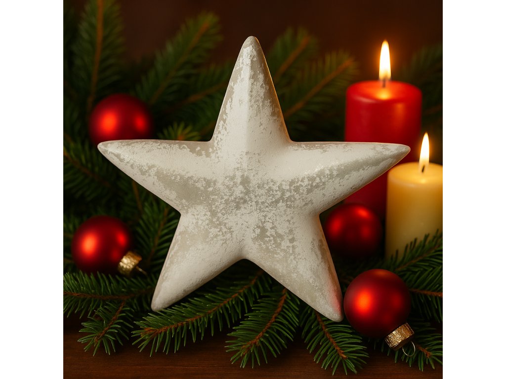 Dekorativní hvězda působí elegantně a zároveň rustikálně díky povrchové patině v bílo-stříbrném tónu. Díky jednoduchému tvaru se snadno kombinuje s ostatními vánočními a zimními dekoracemi – svícny, stromečky nebo věnci.