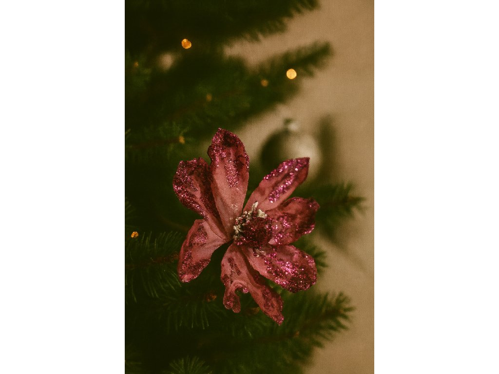 Tento květ magnolie je vyroben z textilního materiálu a ozdoben třpytivým brokátem.Snadno jej upevníte na vánoční stromek, věnec, svícen nebo jiné dekorace. Růžový odstín s glitry působí slavnostně a dodá vašim aranžmá elegantní nádech. Skvěle se kombinuje s dalšími květinovými ozdobami i klasickými koulemi a řetězy.