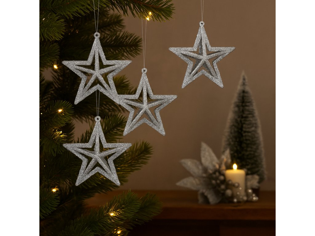 Tato sada stříbrných hvězdiček nabízí univerzální využití při vánoční výzdobě. Díky třpytivému povrchu působí slavnostně a díky nylonové nitce je lze snadno zavěsit. Každá hvězdička má navíc ve spodní části očko, které umožňuje propojení všech hvězd dohromady – vznikne tak malá girlanda. Hodí se na stromek, věnec, záclony nebo do stolních aranžmá.