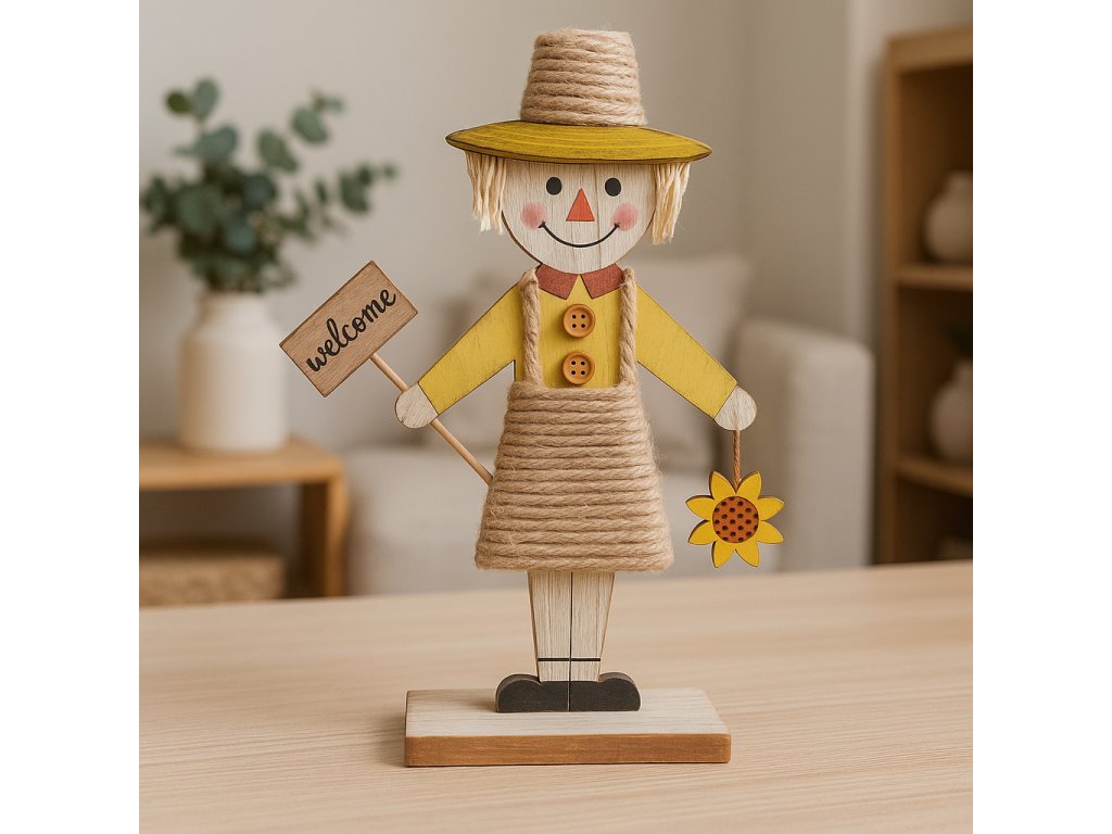 Tato roztomilá postavička spojuje přírodní materiály a ručně působící zpracování. Dřevěná dekorace s jemně rustikálním nádechem vynikne zejména v interiérech laděných do venkovského nebo sezónního stylu – ideální třeba pro podzimní aranžmá.