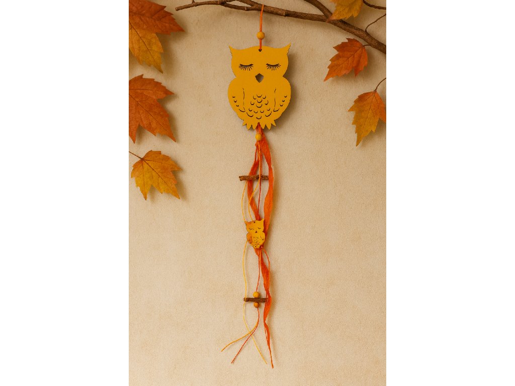 Dřevěný závěs žlutá sova žluto-oranž provázky