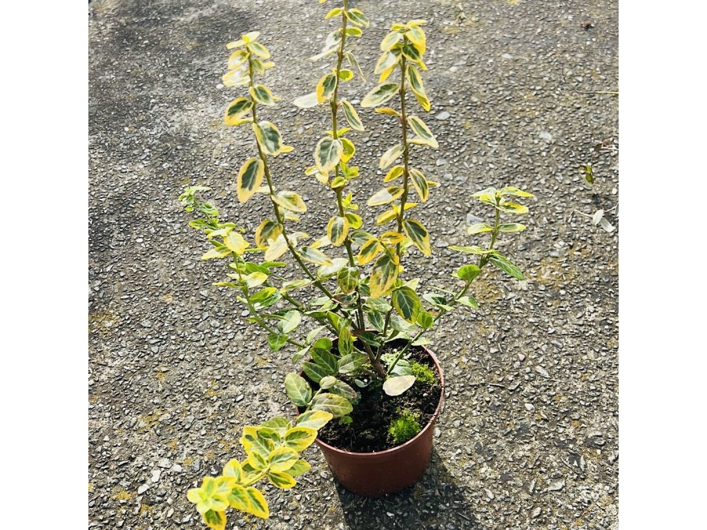- Listy 🍃: Oválné, lesklé, tmavě zelené s výrazným zlatožlutým lemem; v zimě získávají bronzový nádech