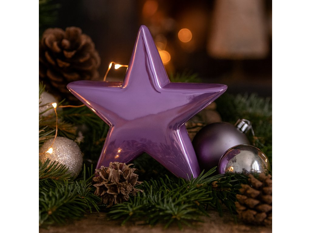 Porcelánová dekorace ve tvaru pěticípé hvězdy s hladkým lesklým povrchem v barvě jemné fialové. Hvězda působí elegantně, harmonicky a snadno se kombinuje s přírodními i kovovými doplňky. Ideální pro vánoční stůl, okenní parapet nebo komodu – skvěle odráží světlo svíček i LED řetězů.