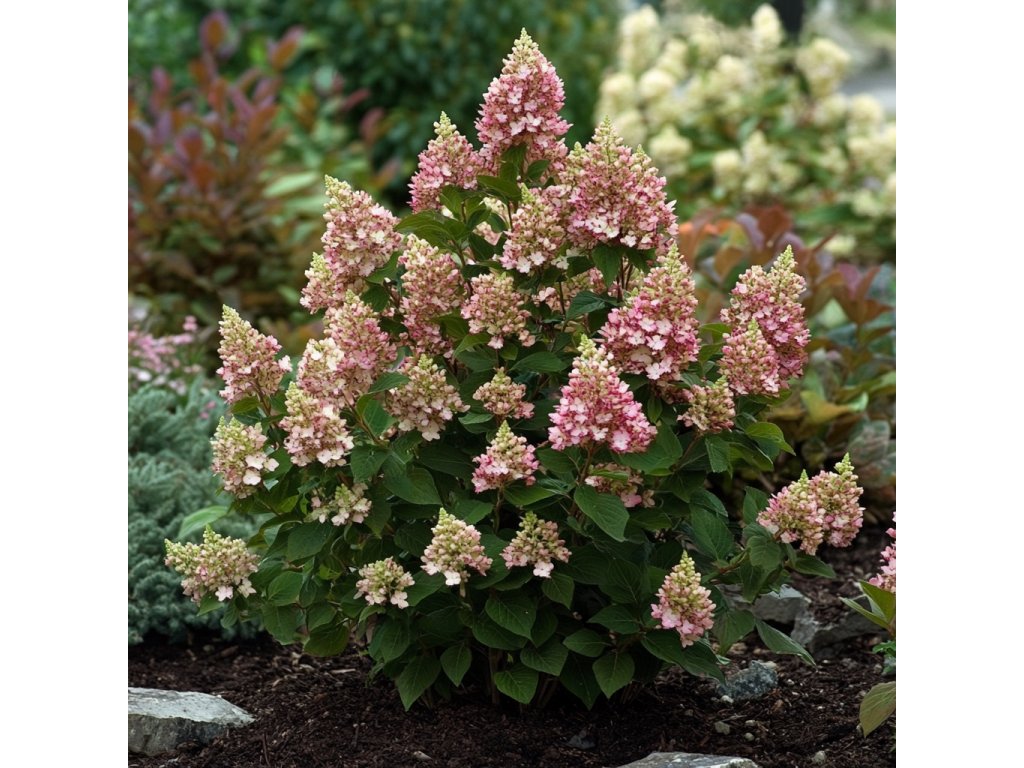 Hortenzie latnatá 'Vanille Fraise' (Hydrangea paniculata 'Vanille Fraise') keř s květy měnícími barvu z bílé na malinově červenou