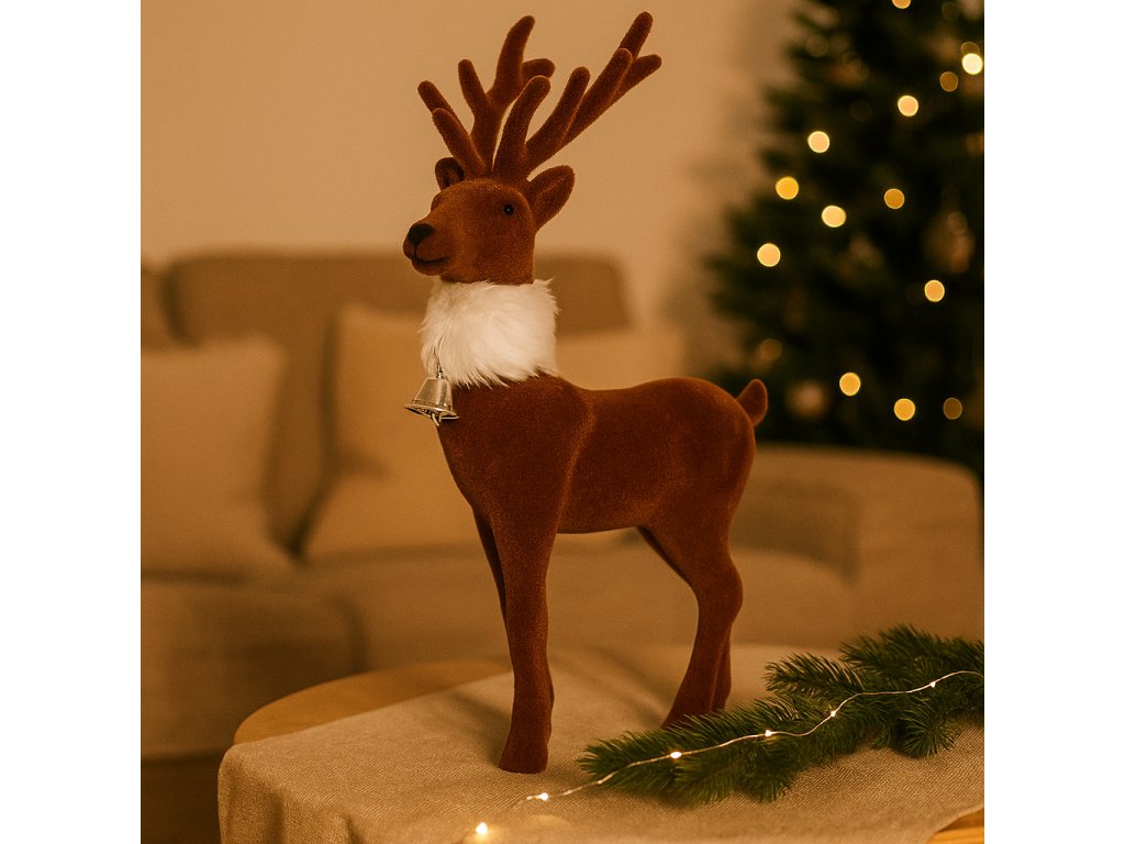 Jelen s rolničkou hnědý – sametová vánoční dekorace s bílou šálou