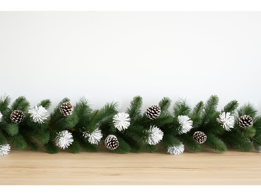Tato luxusní vánoční girlanda Julia o délce 260 cm je tvořena směsí tří druhů 3D jehličí, které působí velmi přirozeně. Zdobí ji přírodní borové šišky a zasněžený povrch, což dodává dekoraci zimní atmosféru. Díky své šířce až 45 cm je výrazným prvkem, který ozdobí zábradlí, stůl, krb nebo vstupní prostor.
