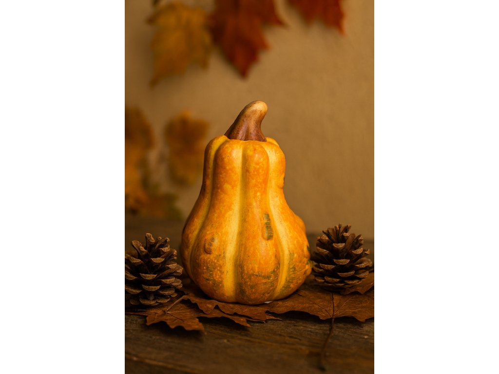 Stylová keramická dýně v přírodní barvě je ideálním doplňkem do podzimního interiéru. Vynikne samostatně i v kombinaci s dalšími dekoracemi, jako jsou šišky, listy či svíčky.