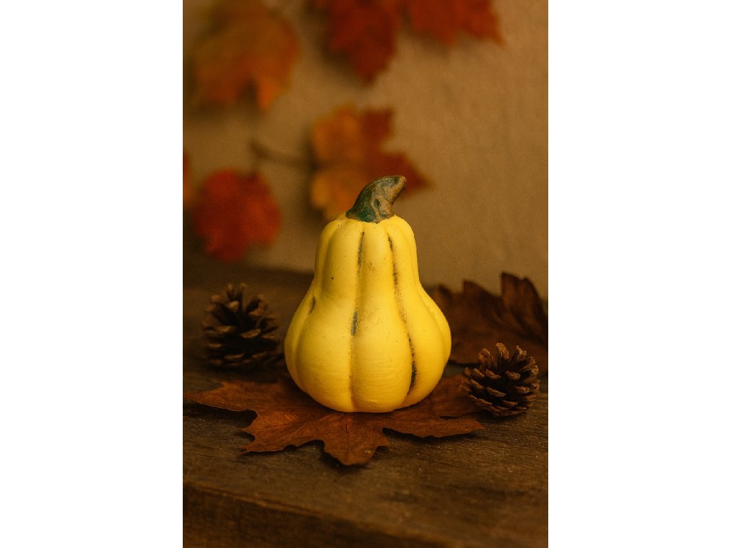 Malá keramická dýně je ideálním doplňkem pro jemné podzimní aranžmá. Díky své velikosti se hodí jako detail na stůl, do vitríny nebo k větším dekoracím, které zvýrazní svou kontrastní jednoduchostí.