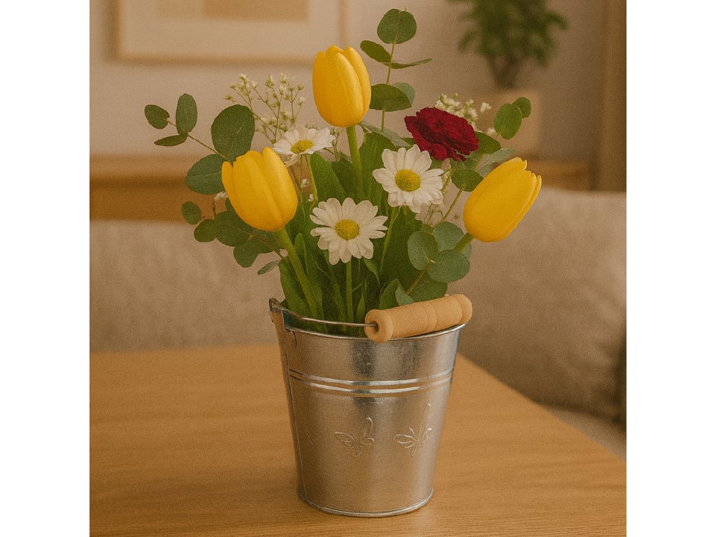Kovový kbelík s dřevěným madlem – univerzální dekorace i praktický doplněk
