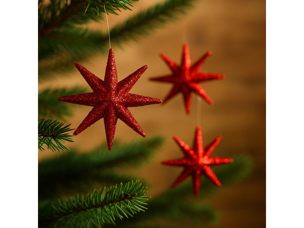 Vánoční ozdoby ve tvaru červených 3D hvězd s různě dlouhými paprsky. Povrch je bohatě posypaný jemnými třpytkami, které zvyšují jejich lesk v umělém i denním světle. Každá hvězdička je opatřena tenkým nylonovým vlascem pro snadné zavěšení. Balení obsahuje tři kusy, ideální pro ozdobení stromku, větviček, věnce nebo svátečního aranžmá.