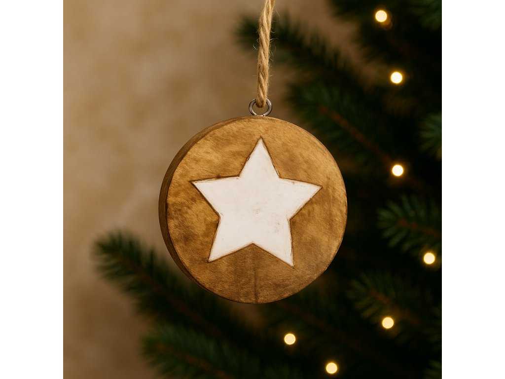Přírodní design a ruční zpracování dodávají každému kusu jedinečný charakter. Jednoduchý tvar s bílou hvězdou působí elegantně a decentně, ideální pro minimalistickou vánoční výzdobu.