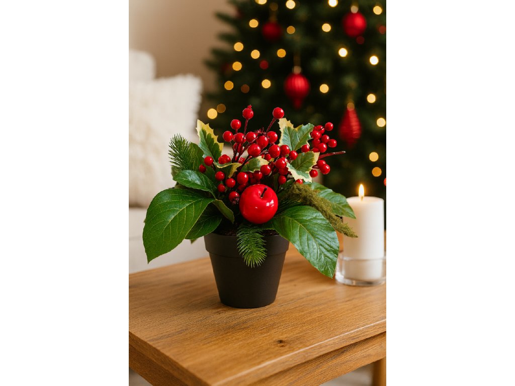 Stylové vánoční aranžmá v černém květináči, tvořené kombinací zelených listů, větviček a červených bobulí doplněných o dekorativní jablíčko. Díky realistickému provedení působí svěže a dodá interiéru slavnostní atmosféru.