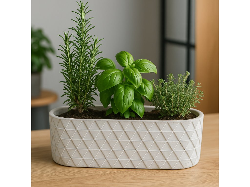 Oválný betonový květináč s geometrickým vzorem