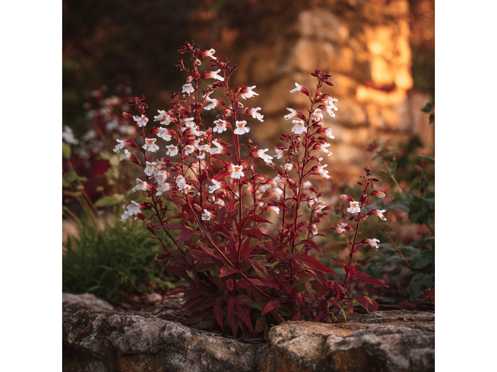 Dračík náprstníkovitý (Penstemon digitalis) ‘Husker Red’ trvalka s vínovými listy a bílými květy