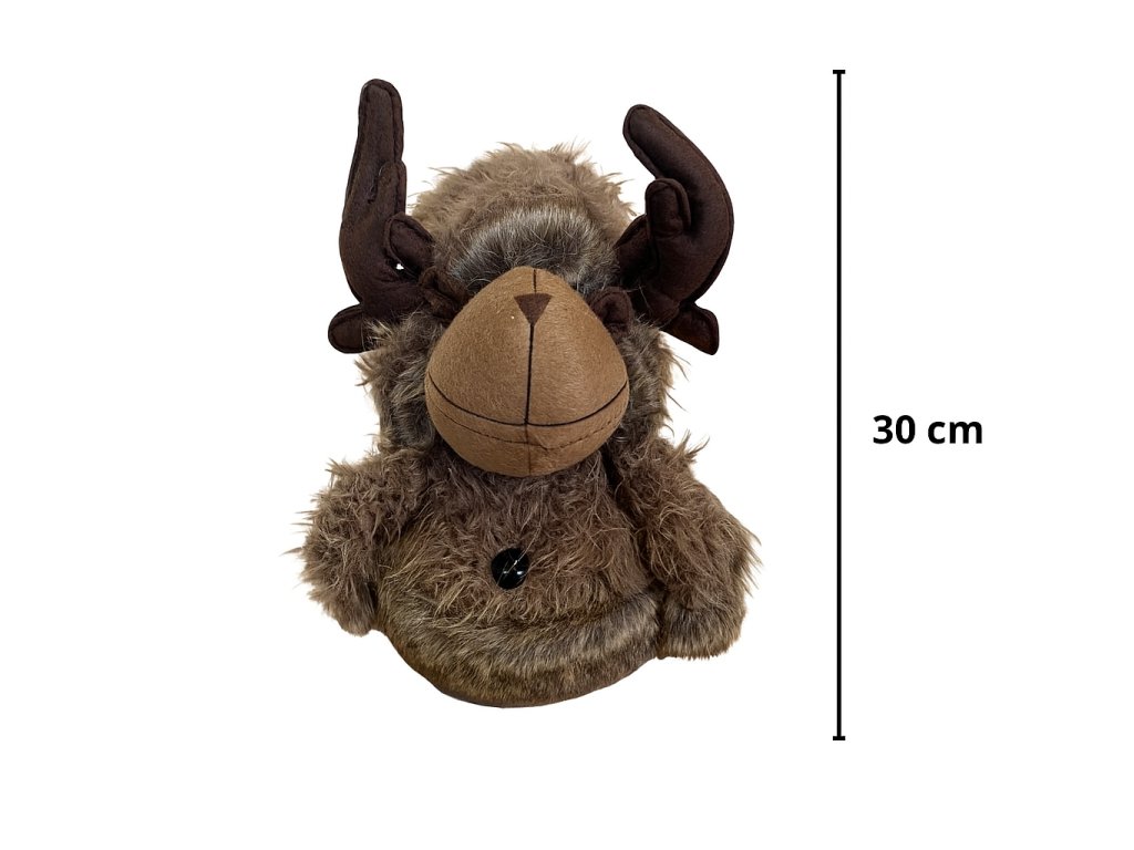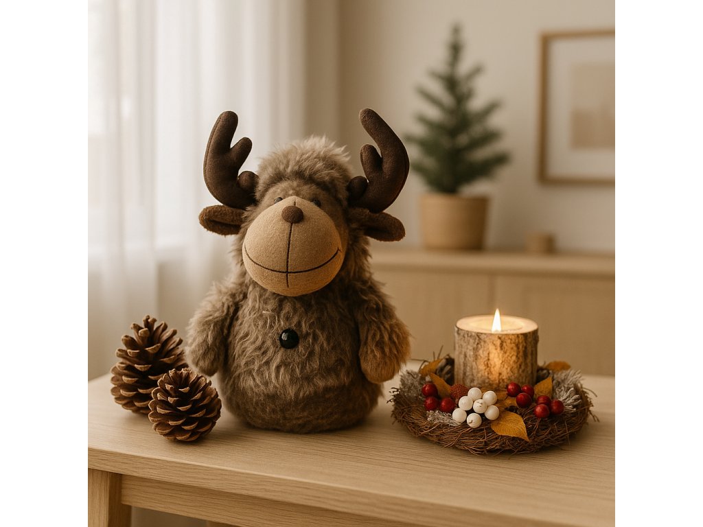 Tento sob je vyroben z jemného plyše s huňatým kožíškem a veselým výrazem. Díky svému přírodnímu hnědému tónu působí hřejivě a skvěle se hodí do zimních aranžmá i jako samostatná dekorace.