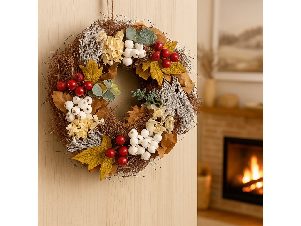 Barevná kombinace žlutých listů, bílých bobulí a červených akcentů působí výrazně a přitom přírodně. Díky univerzálnímu zpracování lze věnec využít nejen na podzim, ale i jako základ pro zimní dekorace.