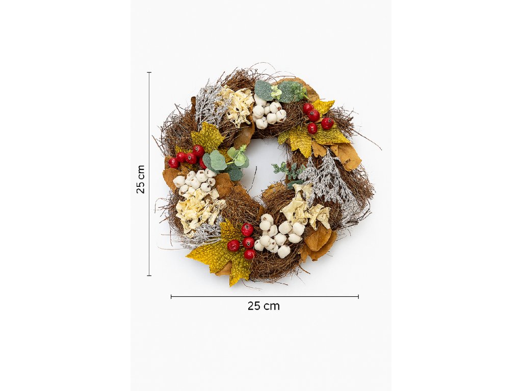 Tento dekorativní věnec přináší do interiéru i exteriéru kousek podzimní přírody. Díky kombinaci sušených listů, květin, bobulí a větviček působí přirozeně a harmonicky. Je ručně aranžovaný tak, aby vydržel a působil dekorativně i bez dalších úprav.