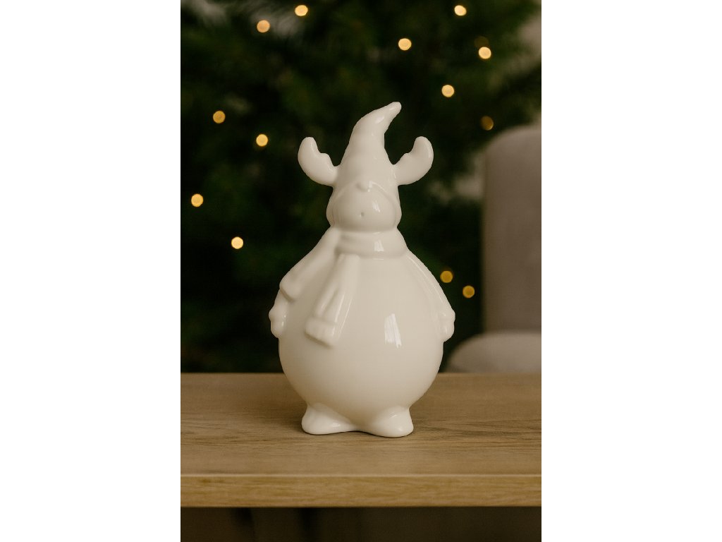 Tento porcelánový sob v bílé barvě s jemným leskem je ideálním doplňkem pro vánoční výzdobu. Kulatý tvar působí hravě, zatímco čepice a šála dodávají figurce zimní atmosféru. Umístěte ho na komodu, parapet nebo vánoční stůl – krásně vynikne samostatně i v kombinaci s dalšími porcelánovými dekoracemi.