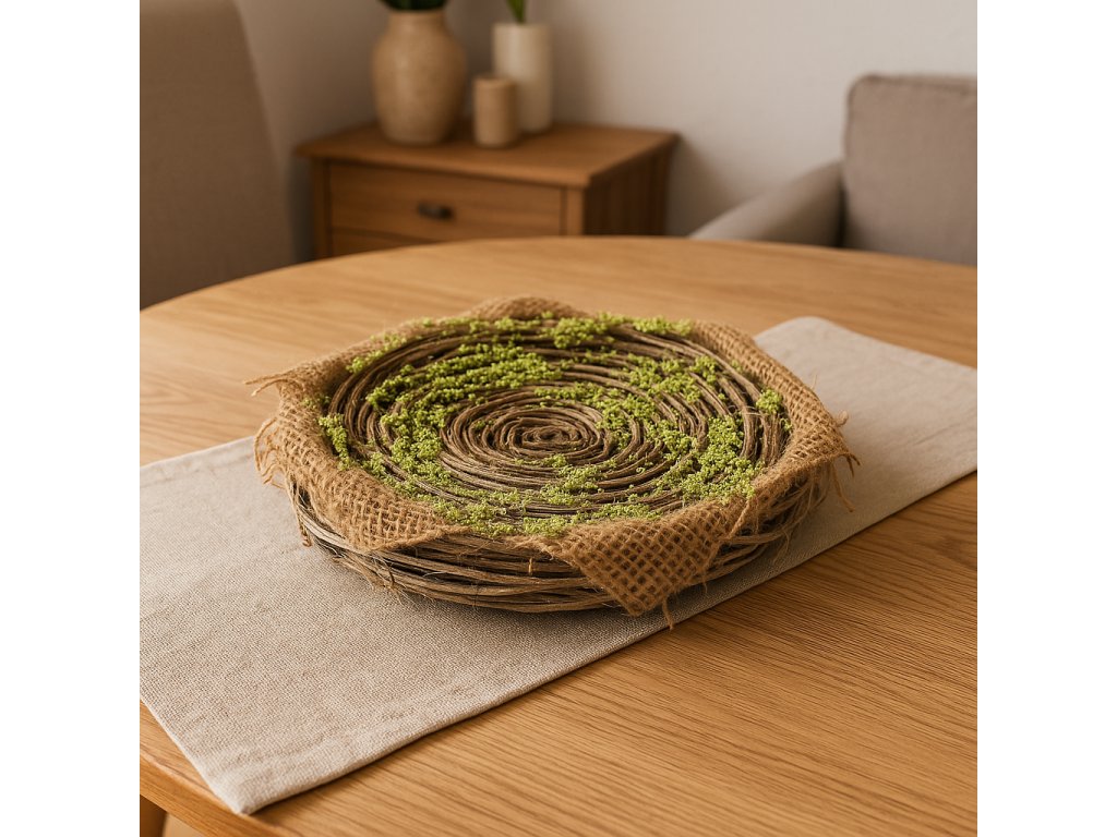 Dekorativní proutěná ošatka s jutovou ozdobou, ručně spletená z přírodního proutí psího vína. Díky svému přírodnímu vzhledu se hodí do rustikálních i moderních interiérů.