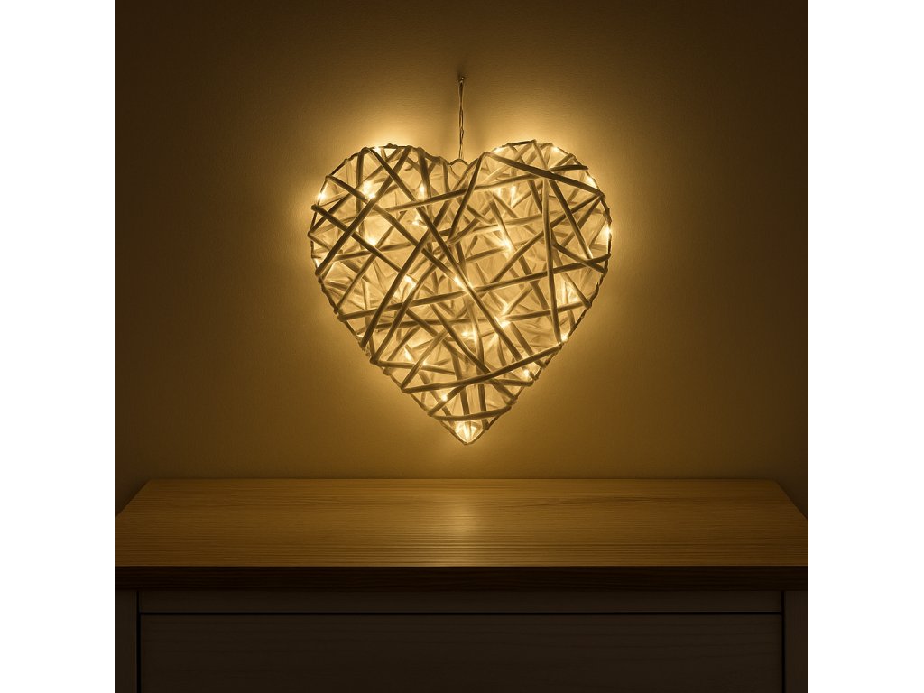 LED osvětlení (15 diod) svítí teplým bílým světlem a umocňuje romantický efekt. Dekorace se hodí do obývacího pokoje, ložnice i na chodbu – například na dveře, okno nebo stěnu.