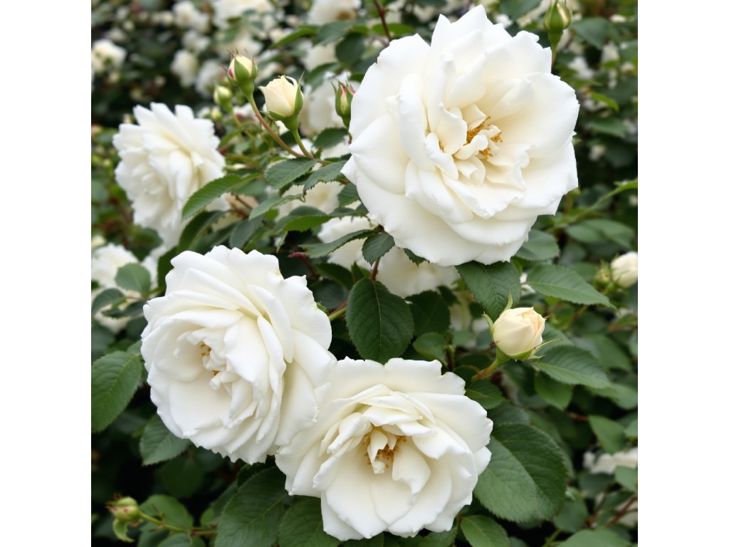 - Květy 🌸: Bílé, plné, středně velké až velké, s jemnou vůní, opakované kvetení