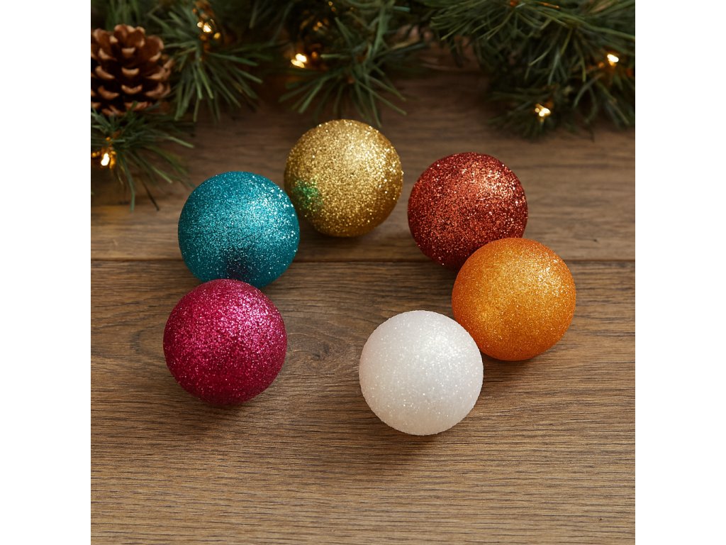 Tato sada vánočních koulí obsahuje mix barev – červenou, zelenou, modrou, bílou, růžovou a zlatou. Koule jsou zdobené jemnými třpytkami, které jim dodávají slavnostní vzhled. Díky lehkému plastovému provedení nezatěžují větve stromku a jsou vhodné i pro stolní aranžmá, věnce nebo dekorace v miskách. Balení obsahuje 6 kusů, které dohromady vytvoří veselou a pestrou atmosféru.