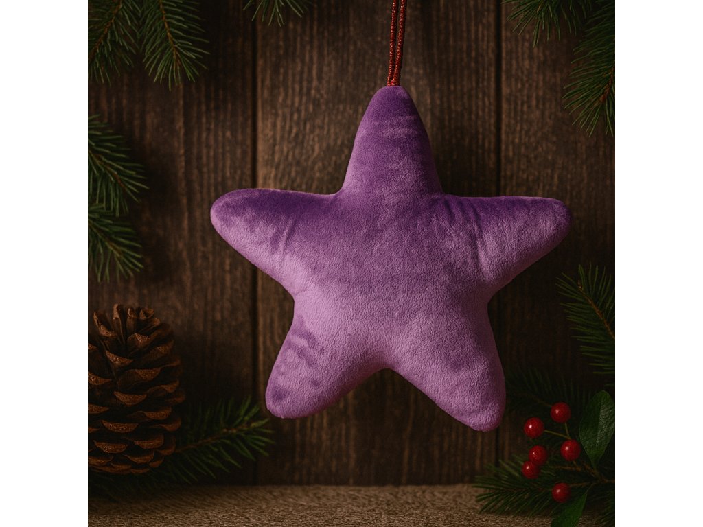 Závěsná vánoční ozdoba ve tvaru pěticípé hvězdy z měkkého sametu. Fialový textilní povrch je příjemný na dotek, výplň z vatoviny drží tvar a zajišťuje objem. Červený provázek umožňuje rychlé zavěšení na stromek, větvičky nebo háček.