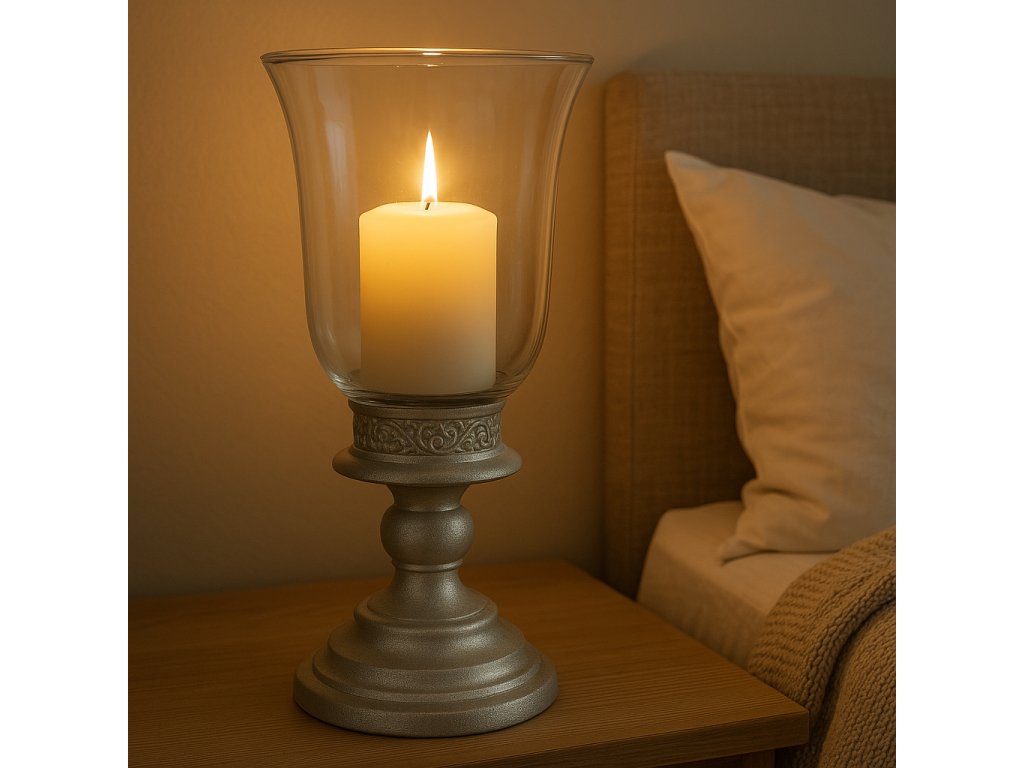 Tento svícen kombinuje čiré sklo a dekorativní patinovaný podstavec, což mu dodává nadčasový vzhled. Díky své výšce a stabilitě působí výrazně a stává se elegantní dominantou interiéru.