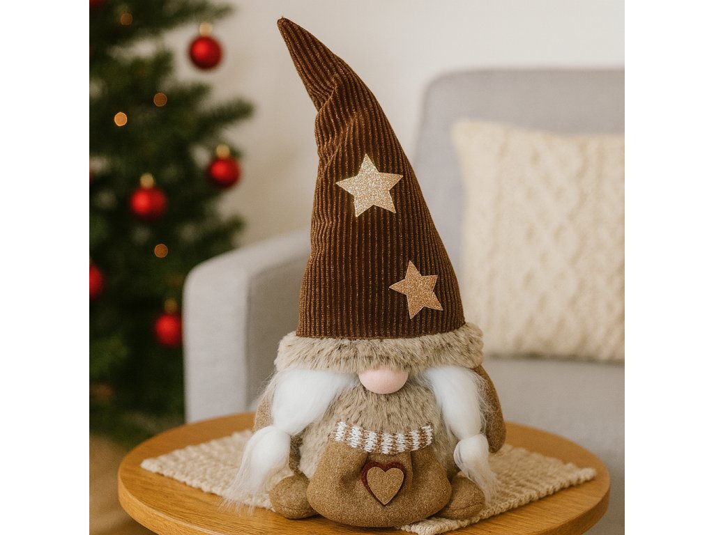 Tento vánoční skřítek vnese do vašeho domova kouzelnou atmosféru. Má dlouhou hnědou čepici z manšestru ozdobenou hvězdami, jemný vous a měkké tělo s dekorativním srdíčkem. Díky své stabilní základně dobře drží na stole, komodě nebo na okenním parapetu. Kombinace přírodních tónů a jemných detailů dělá z tohoto skřítka ideální doplněk pro útulný interiér i vánoční aranžmá.