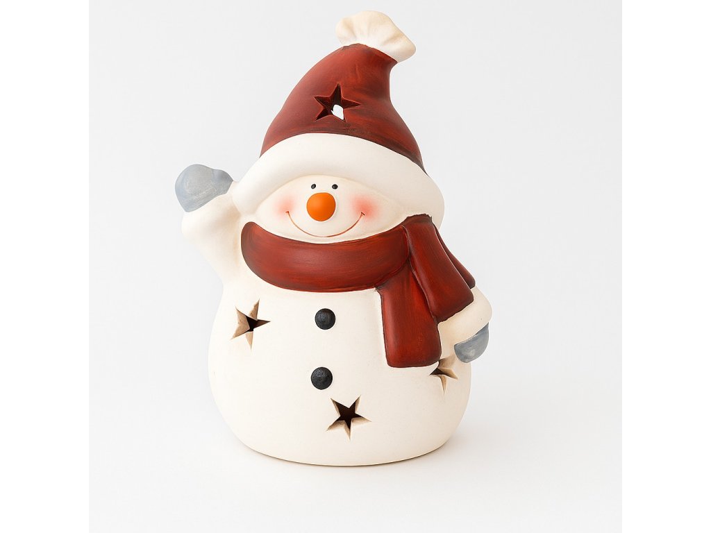 Tento veselý sněhulák vnese do interiéru radostnou zimní atmosféru. Je oblečený do červené čepice s hvězdičkou a šály v ladícím tónu. V těle má výřezy ve tvaru hvězd, které umožňují po vložení svíčky nebo LED světýlka vytvořit krásnou hru světel.