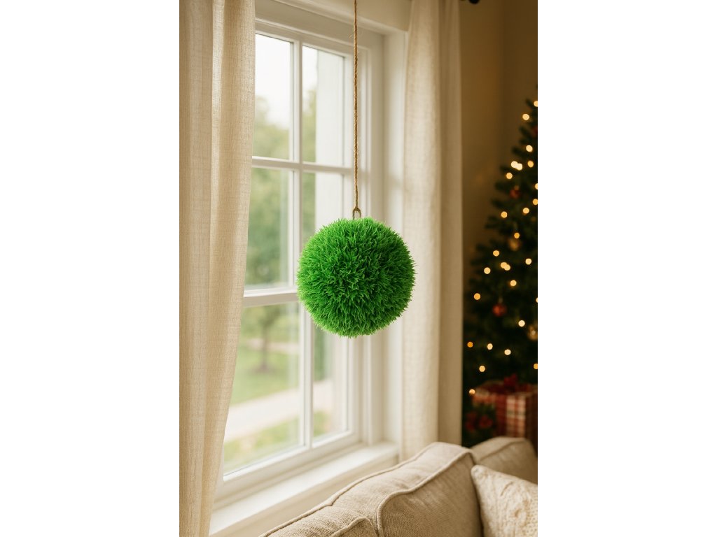 Kulatá závěsná dekorace z jemně zpracované umělé trávy v zelené barvě. Přirozený vzhled doplňuje zlatá bavlnka pro snadné zavěšení.