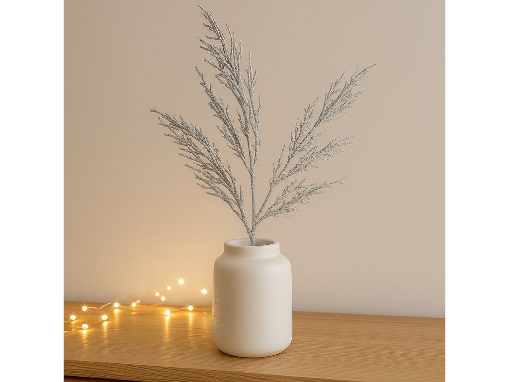 Stříbrná větvička chřestu (asparagus) působí velmi jemně a slavnostně. Díky bohatému sypání třpytem a realistickému tvaru větviček krásně odráží světlo a dodá lesk každému vánočnímu nebo zimnímu aranžmá. Jednotlivé větévky jsou tvarovatelné a stonek je ohebný, což umožňuje snadné umístění do vázy, věnce či sváteční dekorace. Skvěle ladí se zlatými, bílými i přírodními doplňky.