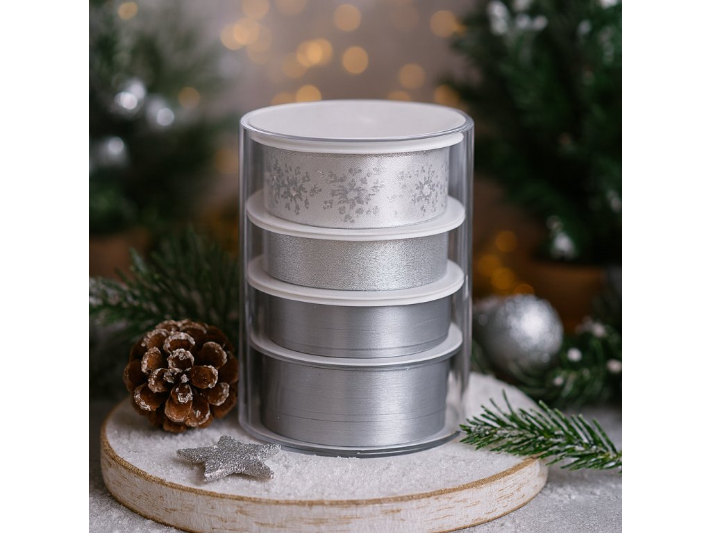 Set čtyř ozdobných stužek ve stříbrném provedení nabízí široké využití při zdobení dárků, věnců, svícnů i vánočních dekorací. Každá stuha je navinuta na samostatné plastové cívce a uložena v průhledném válci pro přehledné skladování. Jemné lesklé provedení působí elegantně a slavnostně.