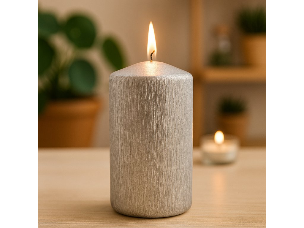 Svíčka válec 6 Emocio – stříbrná dekorativní svíčka 5×10 cm