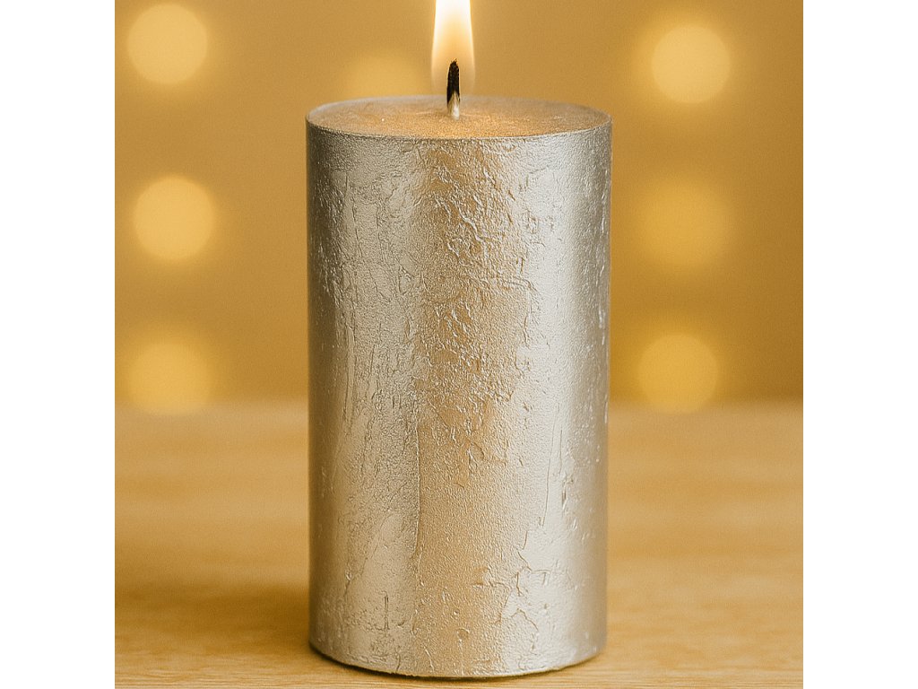 Stříbrná svíčka se hodí k vytvoření svátečního aranžmá na stole, do lucerny nebo na podnos. Lze ji kombinovat s bílými, zlatými nebo šedými doplňky pro elegantní a klidný vzhled.