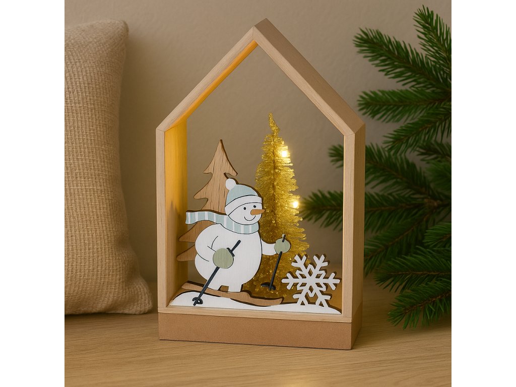Svítící dřevěný domeček se stromky a sněhulákem na lyžích
